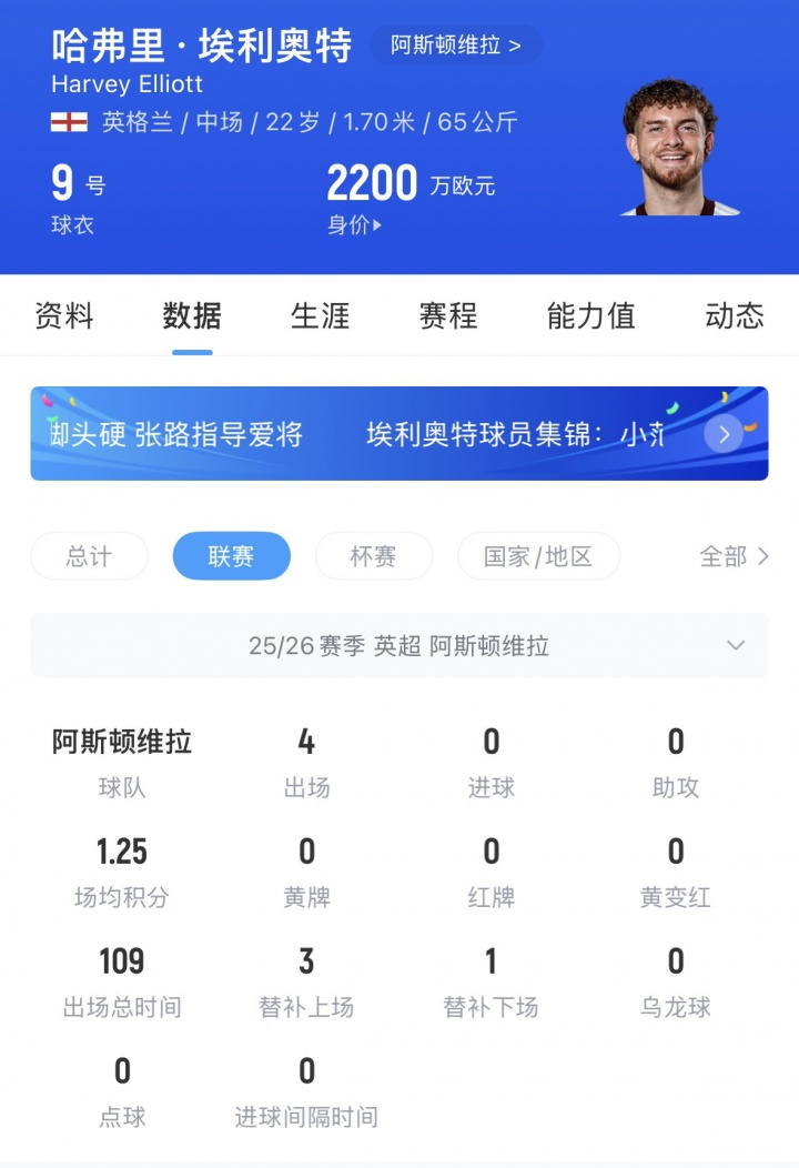 埃利奧特現(xiàn)年22歲,他去年夏天被利物浦租借給維拉,但本賽季至今僅出場(chǎng)7次共270分鐘,貢獻(xiàn)1球。他的身價(jià)連續(xù)兩次下跌,從3500萬(wàn)歐跌剩2200萬(wàn)歐。