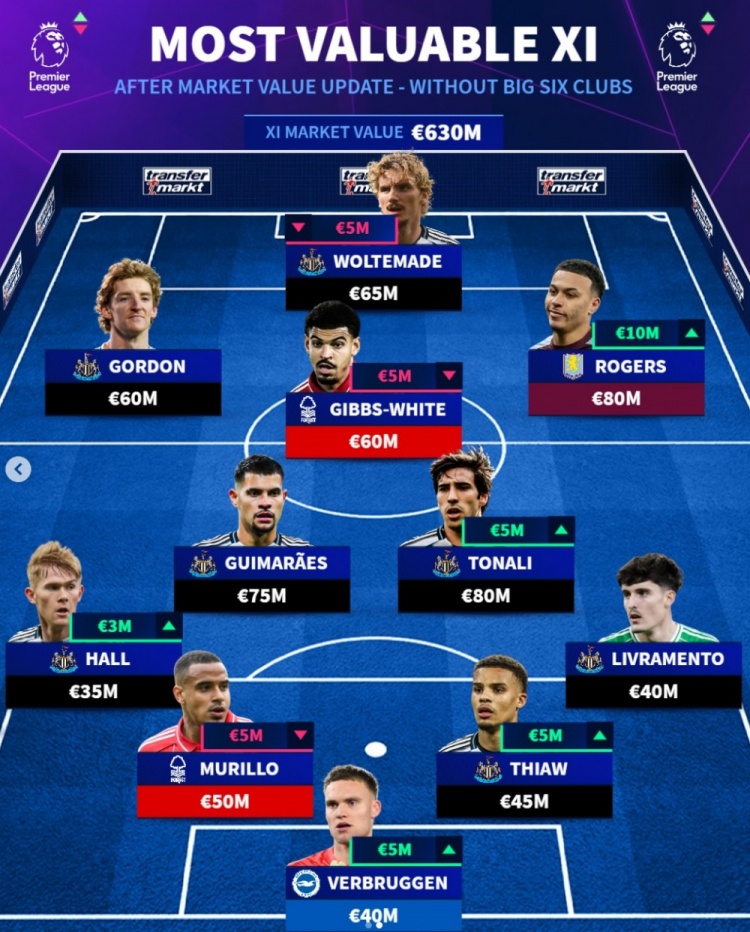 直播吧3月10日訊 德轉(zhuǎn)在北京時(shí)間3月9日更新了英超球員身價(jià),并列出了更新后無big6球員在內(nèi)的身價(jià)最貴陣容,托納利、摩根·羅杰斯8000萬歐領(lǐng)銜,紐卡7人在列,總身價(jià)6.3億歐。