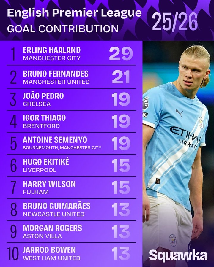 直播吧3月10日訊 Squawka統(tǒng)計(jì)了本賽季英超的參與進(jìn)球榜(進(jìn)球+助攻),哈蘭德位列第一。