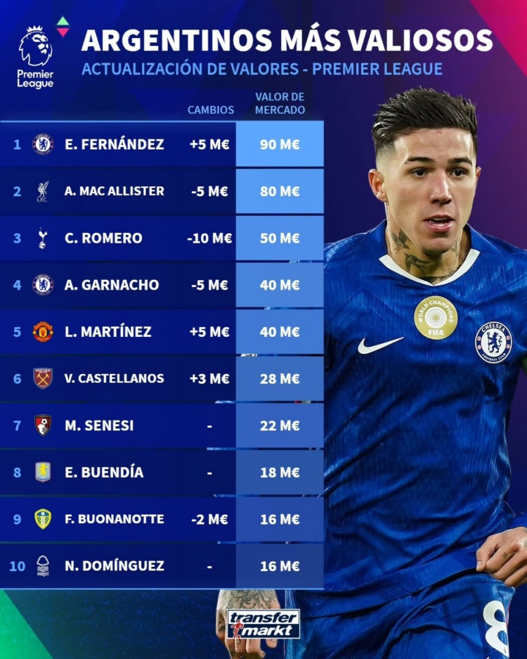 直播吧3月10日訊 德國(guó)轉(zhuǎn)會(huì)市場(chǎng)更新了英超球員的身價(jià),并列出英超阿根廷球員德轉(zhuǎn)身價(jià)排名,恩佐9000萬(wàn)歐居首。