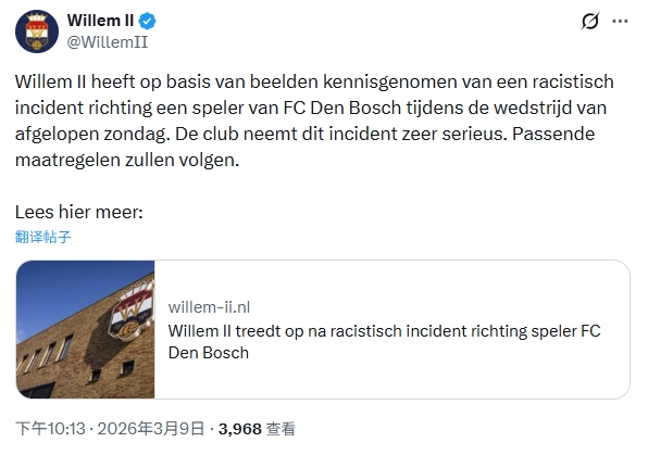 這場比賽于北京時間3月8日21:30開球,23:27左右完賽。賽后不到24小時,北京時間3月9日22:13,威廉二世俱樂部發(fā)布公告表示已通過視頻得知此次歧視事件,俱樂部高度重視并立即向鄧伯什以及王博豪致歉,現(xiàn)已鎖定歧視者并將采取相應(yīng)的措施。