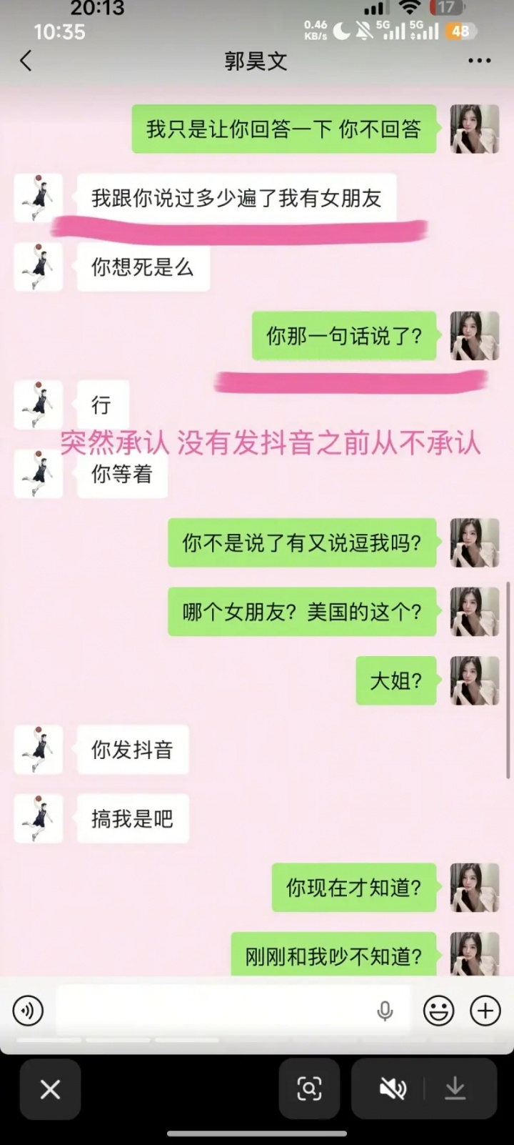 ZW曬聊天記錄,控訴郭昊文在外宣稱是ZW自愿做小三;