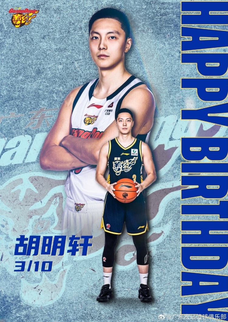 直播吧3月10日訊 今天是廣東男籃球員胡明軒的28歲生日,廣東男籃官博為其送上生日祝福。