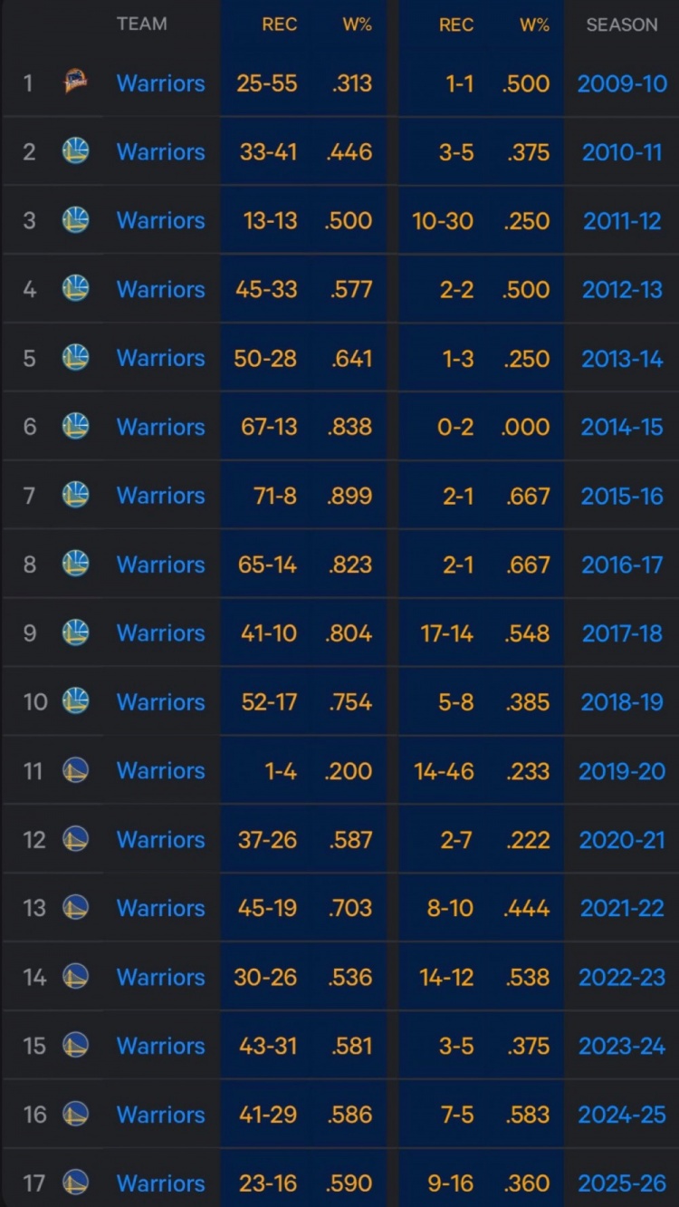 以2025-26賽季為例,庫(kù)里出戰(zhàn)時(shí)勇士戰(zhàn)績(jī)23-16,勝率59.0%