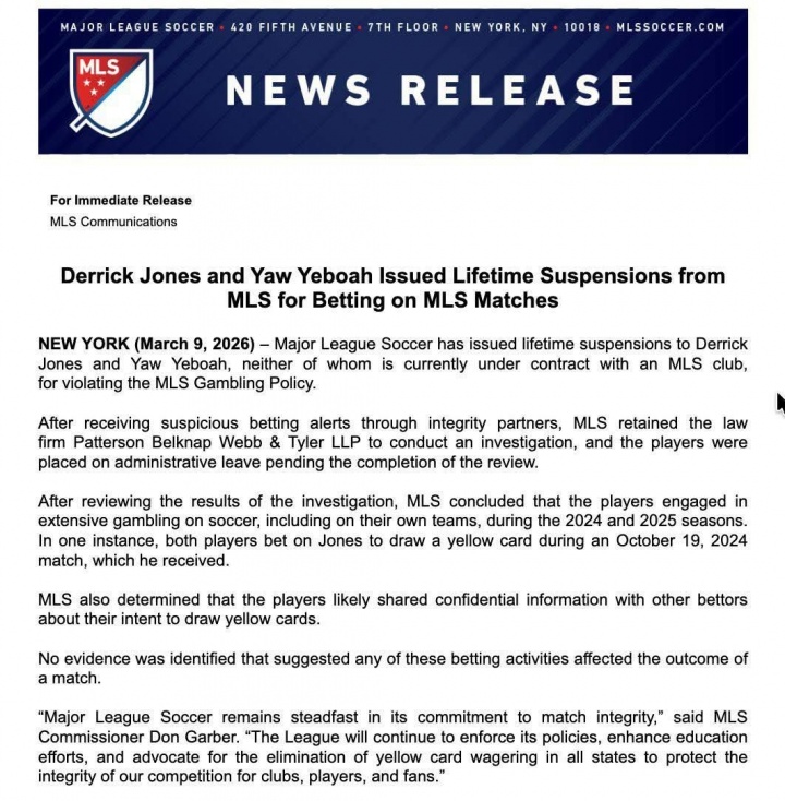 直播吧03月10日訊 美職聯(lián)官方3月9日宣布,對曾效力美職聯(lián)的兩名球員德里克·瓊斯和葉博亞處以終身禁賽,原因是他們曾參與涉及美職聯(lián)比賽的賭博活動。其中,葉博亞正是中超青島海牛隊(duì)今年冬窗引進(jìn)的新援。