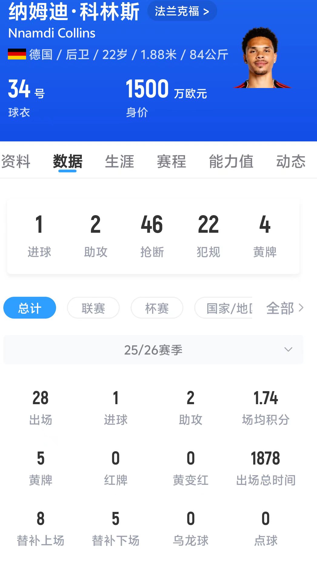 納姆迪·科林斯目前22歲,本賽季為法蘭克福出場(chǎng)28次,貢獻(xiàn)1球2助攻和46次搶斷,目前身價(jià)1500萬歐元。