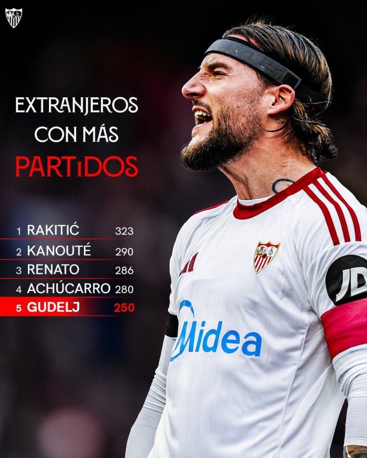 此役34歲塞爾維亞中衛(wèi)古德利首發(fā)踢滿全場,塞維利亞官方確認,他成為隊史出場第5多的外援。