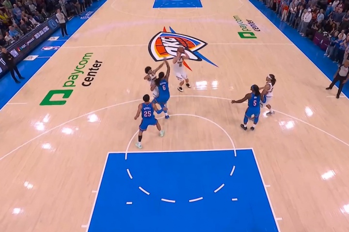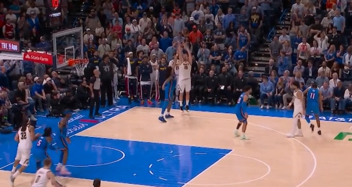 裁判吹罰約基奇三分有效,穆雷加罰一球;兩人合力極限3+1追平比分。掘金126-126雷霆