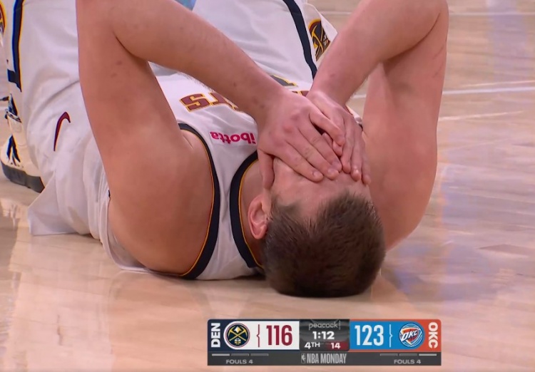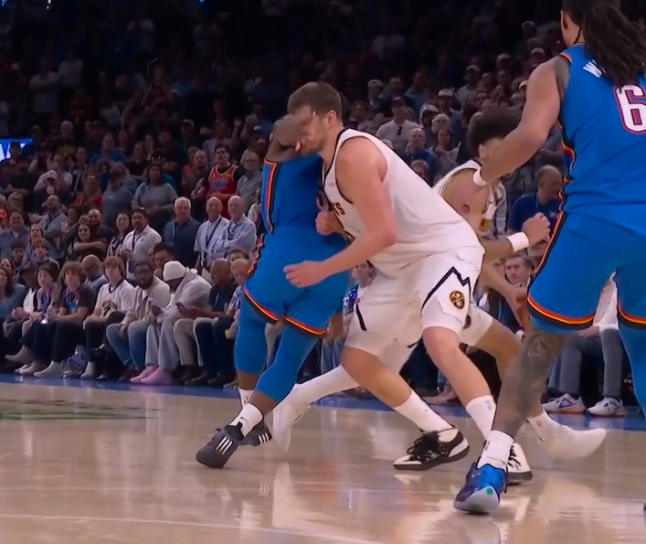 約基奇痛苦倒地,暫停回來后兩罰一中。掘金117-123雷霆