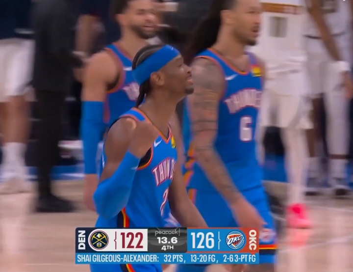末節(jié)13.9秒,亞歷山大單打布勞恩,三分干拔命中。掘金122-126雷霆