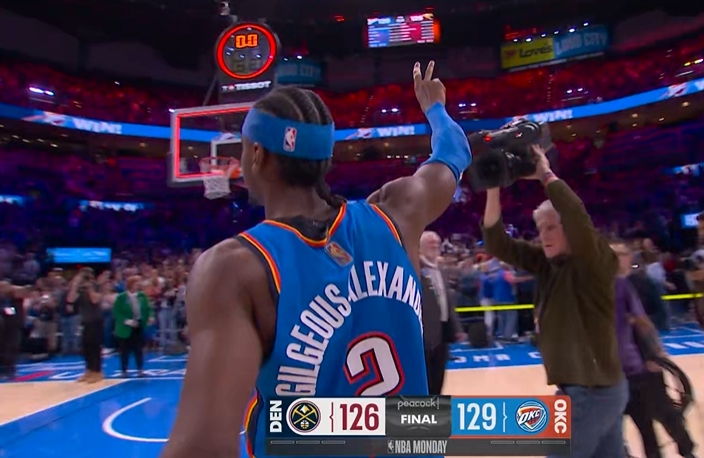 末節(jié)2.7秒,亞歷山大左側(cè)45°橫撤步三分命中,完成準(zhǔn)絕殺!掘金126-129雷霆。