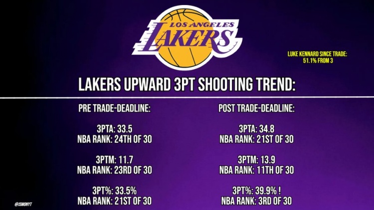 交易得到肯納德后:場均出手34.8次(聯(lián)盟第21),命中13.9記(第11),三分命中率39.9%(第3)
