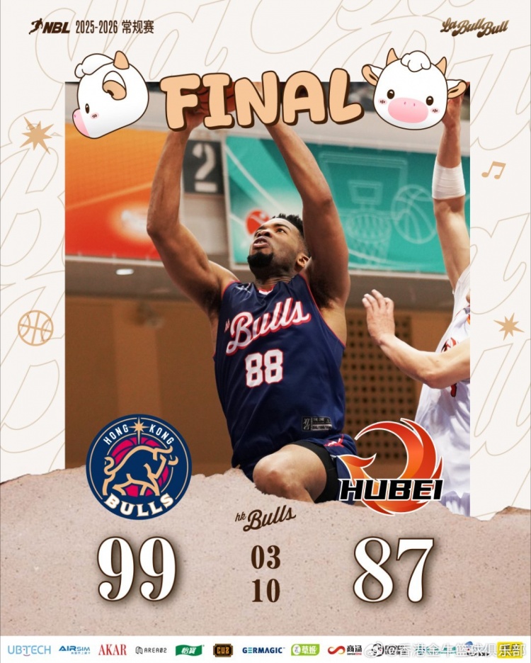 末節(jié)比賽,盧藝文突破分球助攻侯天一籃下輕松打進,唐才育與厄特爾相繼投進三分,阿諾斯克完成雙手暴扣并打成2+1,此后球隊穩(wěn)扎穩(wěn)打掌控局勢。全場比賽結(jié)束,香港金牛99-87戰(zhàn)勝湖北文旅。