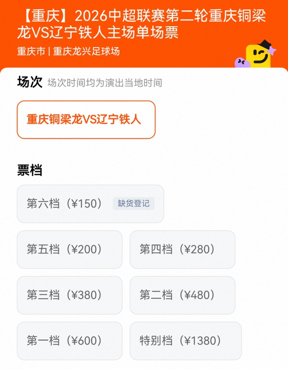 網(wǎng)絡(luò)訂票平臺和銅梁龍官方票務(wù)公告都顯示,這場比賽的球票價格分別為150元/200元/280元/380元/480元/600元/1380元。目前網(wǎng)絡(luò)訂票平臺上只有150元價位的球票顯示缺貨,其他幾個價位都有余票。