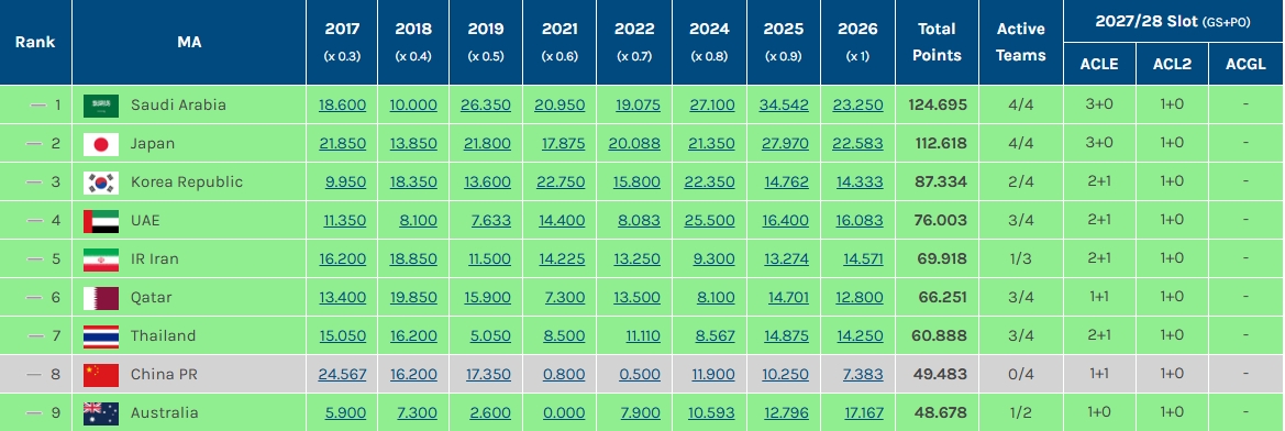 因此中超球隊(duì)得以在27-28賽季保留三個(gè)亞冠席位,澳超球隊(duì)則還是1個(gè)亞冠精英聯(lián)賽正賽+1個(gè)亞冠二級(jí)聯(lián)賽正賽席位。