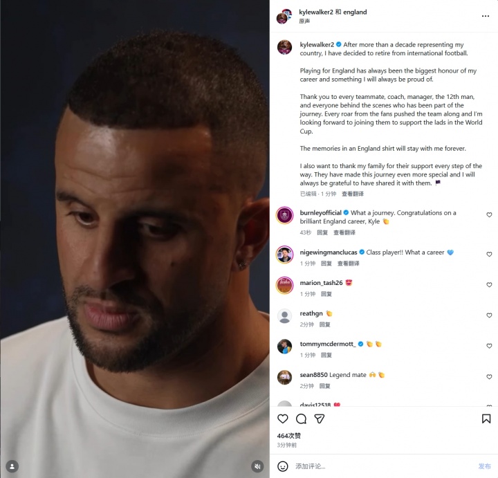 直播吧03月10日訊 官方消息,35歲前熱刺、曼城后衛(wèi)凱爾·沃克宣布,將從英格蘭隊(duì)退役。