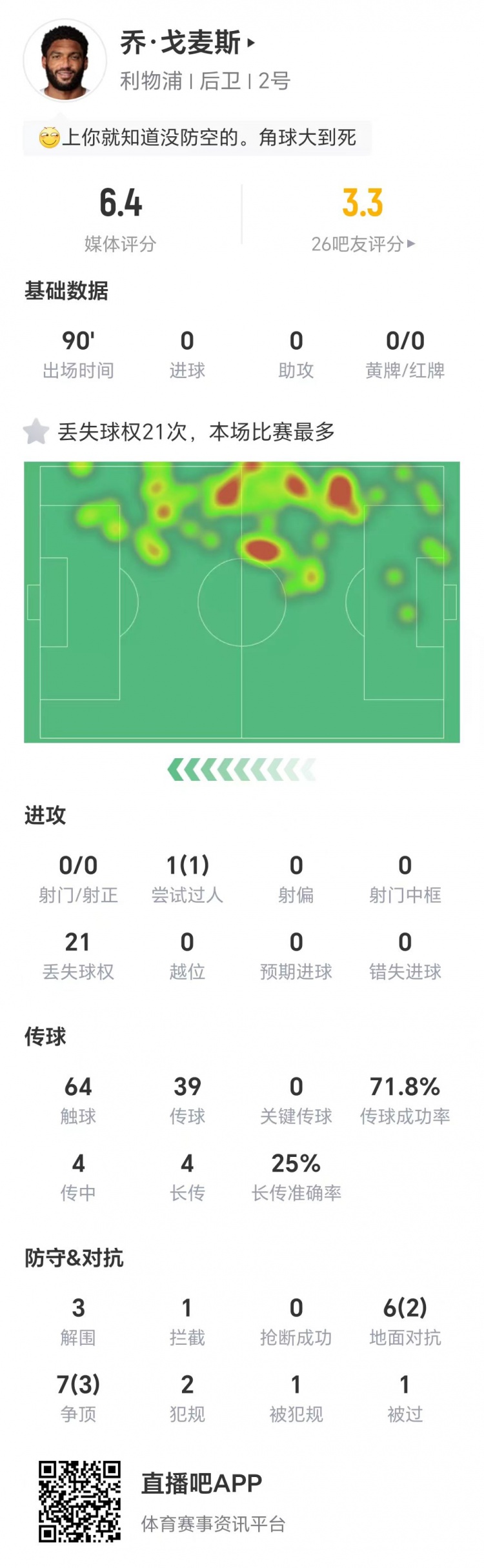 賽后技術(shù)統(tǒng)計數(shù)據(jù)顯示,喬·戈麥斯本場比賽21次丟失球權(quán)全場最多,無關(guān)鍵傳球,3次解圍,1次攔截,6次地面對抗僅成功兩次,7次爭頂成功3次,獲評6.4分。