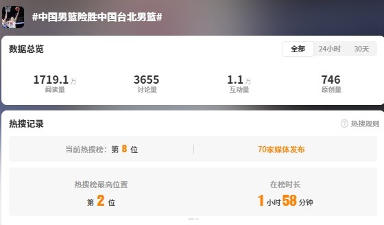 賽后,“中國男籃險(xiǎn)勝中國臺(tái)北男籃”的詞條沖上微博熱搜,最高排名第二位!