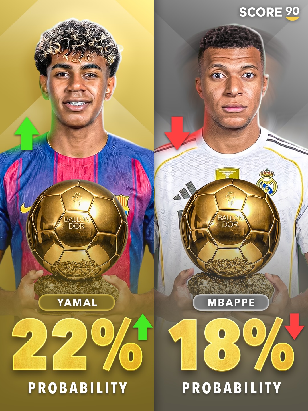直播吧03月11日訊 外媒score90近日根據(jù)相關(guān)機(jī)構(gòu)賠率,更新了今年金球獎(jiǎng)的獲獎(jiǎng)概率,姆巴佩的獲獎(jiǎng)概率下跌到18%,而巴薩小將亞馬爾則上漲到22%。