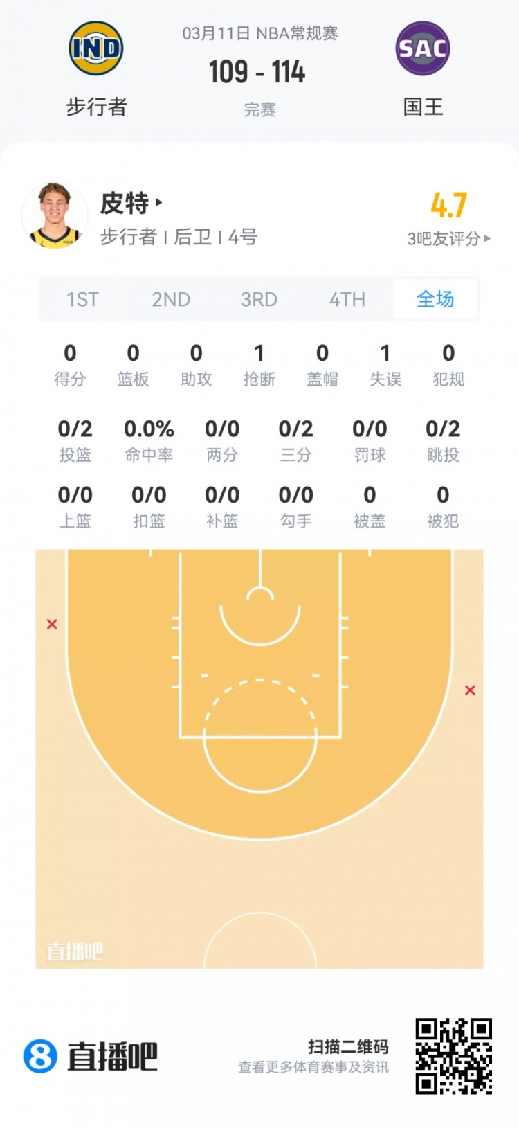 步行者次輪54號秀泰倫·皮特 登場4.8分鐘