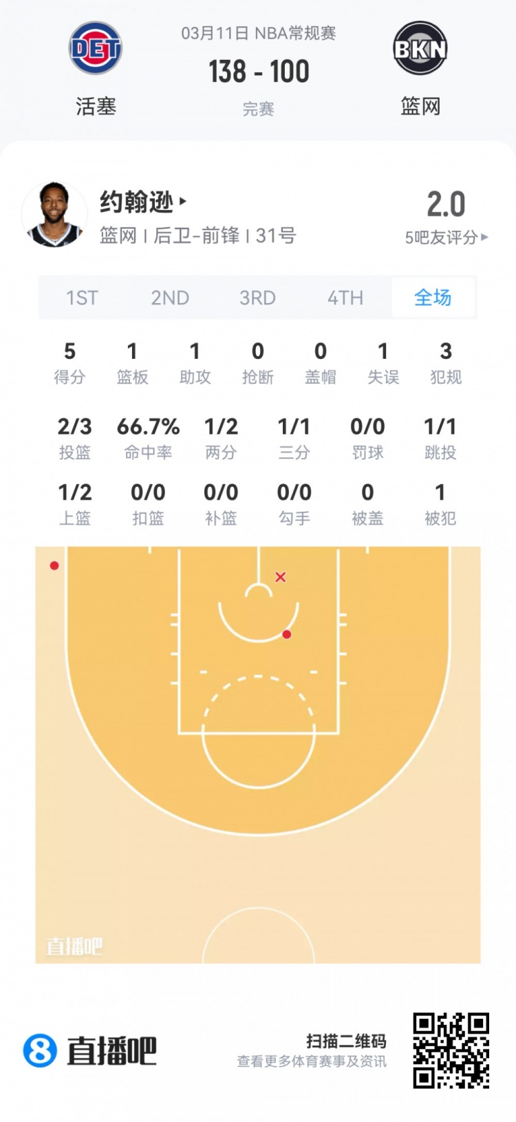 籃網(wǎng)首輪19號秀特拉奧雷 登場16分鐘