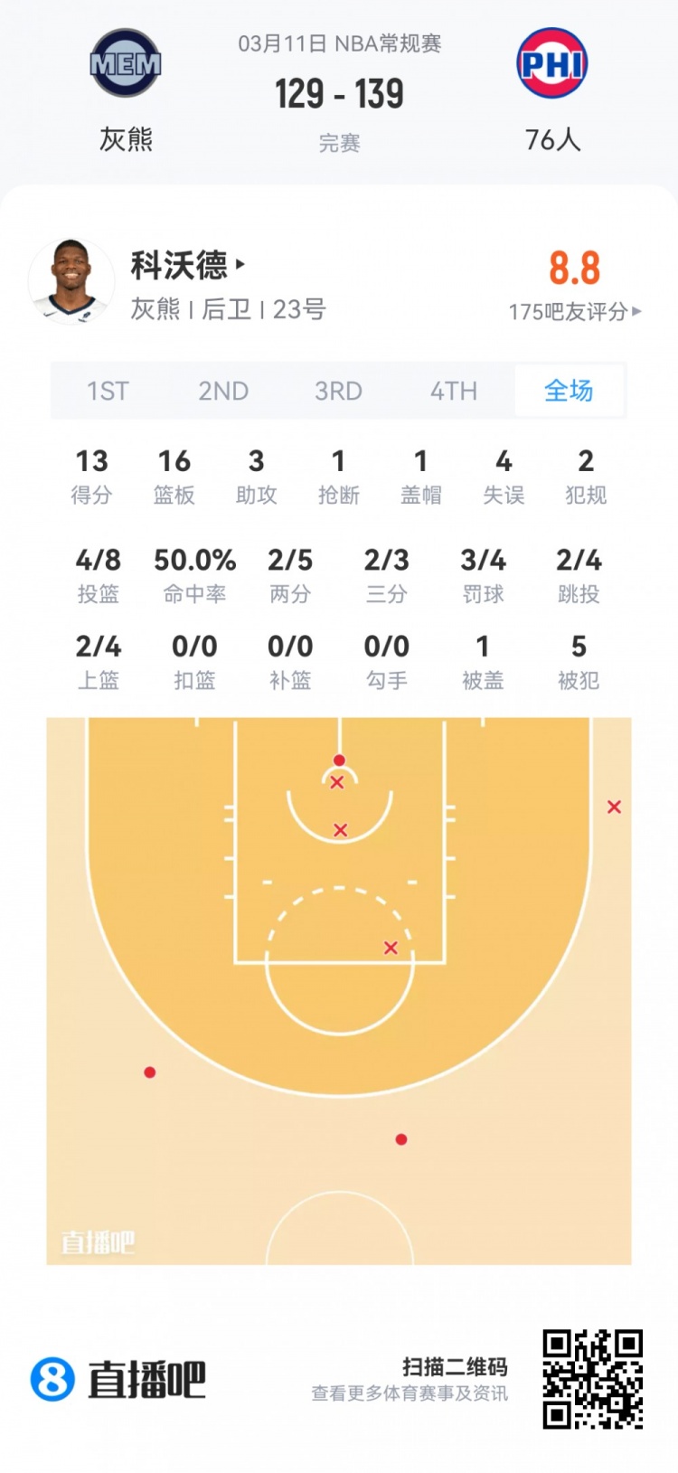 灰熊首輪11號秀科沃德 登場23.8分鐘